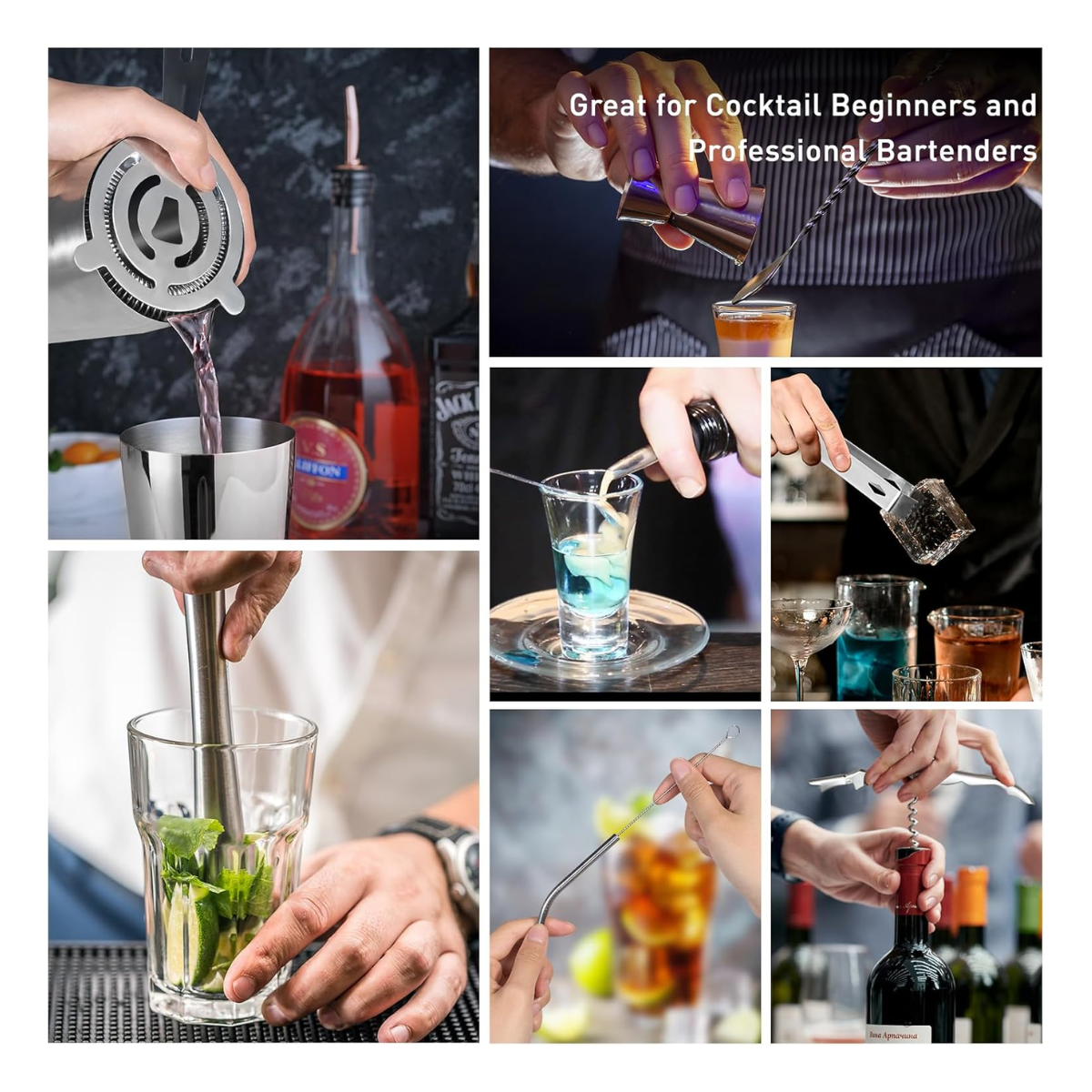 Versatilidade incrível: com este jogo de coquetel, você pode fazer facilmente todo tipo de bebida que você gosta. Você pode usá-lo para fazer trajes em casa ou usá-lo como uma ferramenta profissional para fazer trajes no bar. Este é o kit de licuadora de bebidas perfeito para fazer receitas de sorvetes compatíveis com Margarita, Mojito, Té helado de Long Island ou Chamartini. e elegante, também é feito de aço inoxidável de alta qualidade, a superfície é cepilada, uma prova de fugas e sem arañazos. Todas as peças podem ser limpas na lava-louças, não se oxidam nem corroem, muito fáceis de limpar. Fácil de usar: o jogo de cóctel inclui todas as ferramentas necessárias. Não há dispositivos complicados. Converter em barman é mais fácil do que você pensa. Se você é um amante das bebidas em casa ou um camarero profissional, este kit de cóctel é a escolha perfeita para fazer bebidas deliciosas.
